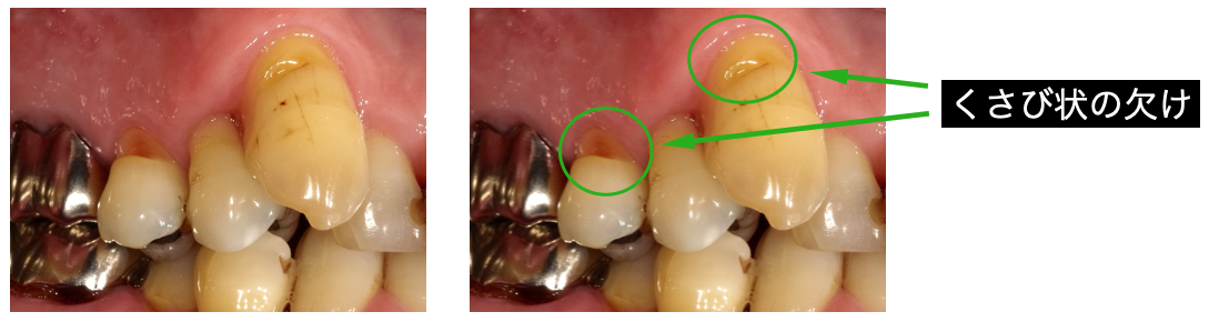 噛み合わせに問題があったり、歯軋りや食いしばりがあると、歯と歯茎の境目の歯質がくさび状に欠けてしまったり、冷たいものに過敏に反応してしまうことがあります。
