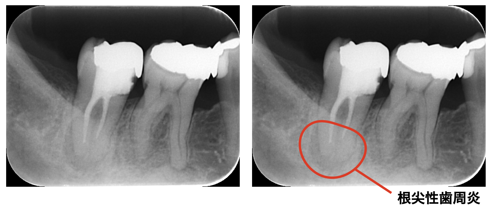 これは「根尖性歯周炎」と呼ばれていて、痛みを伴うものもあれば、無症状に進行するものもあります。