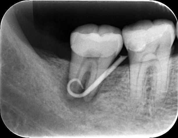 できものの出口からレントゲンに写るゴムを挿入して写真を撮ると、根の先で渦を巻いており、ここに膿の袋ができていることがわかります。