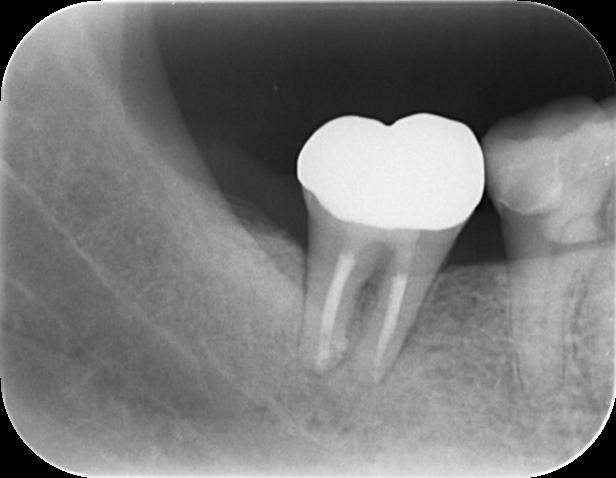 治療後3ヶ月のレントゲンで、歯の根の周りの骨が回復してきているのが確認されます。治癒の経過は仮の被せを装着して噛める状態で確認していきます。