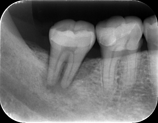 治療前のレントゲンで根の先が黒く写っています。これは歯の中の神経が壊死してしまい感染を起こしています。